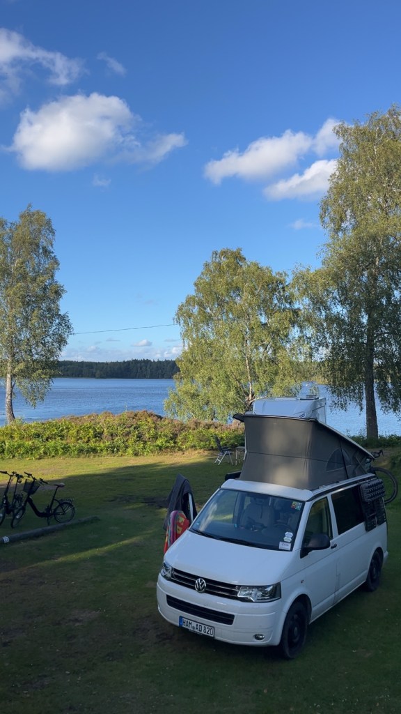Den Tag verbrachte ich sehr entspannt, las viel, ging eine Runde laufen und habe sogar nachmittags 1,5 Stunden auf der Rücksitzbank geschlafen. Auch habe ich den Luxus einer warmen Dusche genossen. Jetzt sitze ich vorm Auto in der Sonne und schaue auf den See.