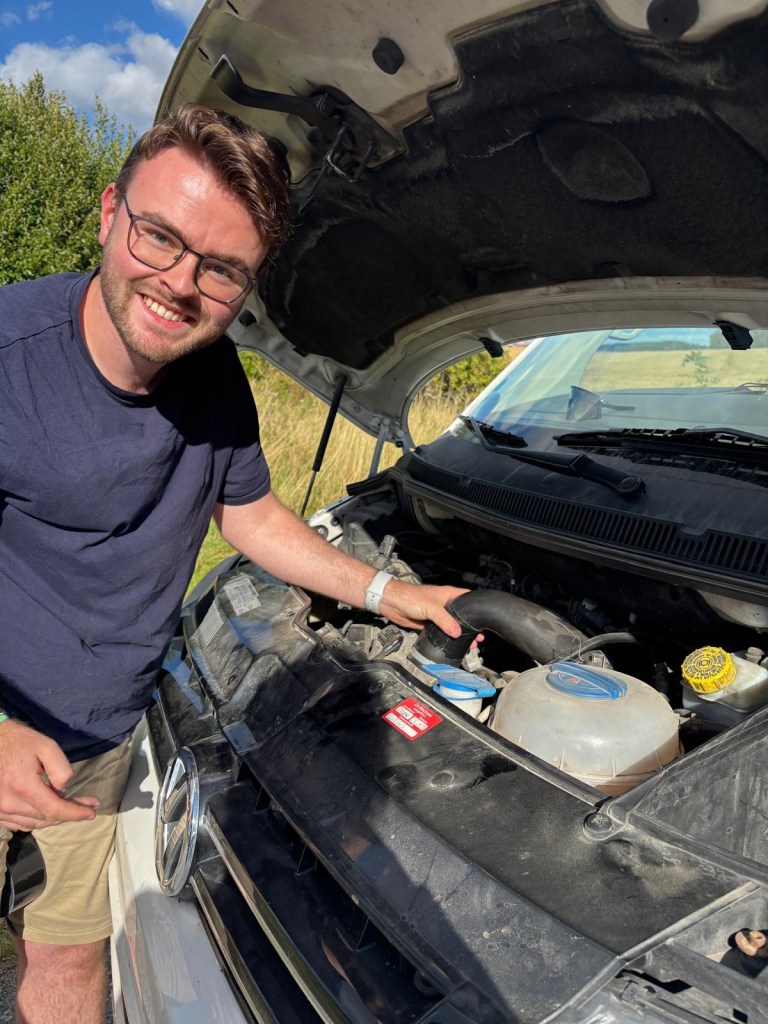 Wir löschten einmal den Fehler in der Hoffnung, dass es nur ein elektronisches Problem war und fuhren ein Stück weiter. Die Leistung war jedoch immer noch sehr stark gedrosselt und ich war ähnlich schnell wie der T3😂. Kurze Zeit später sprang der Wagen wieder in den Notlauf und die Glühspindel blinkte. Also wieder runter von der Landstraße. Irgendwie ist auf dieser Reise echt der Wurm drin und das Auto macht echt einige Probleme. Nach einem Blick unter die Motorhaube und einem genauen Gucken fiel mir ein Loch in den Schlauch zwischen dem Motorblock und dem Ladeluftkühler auf.