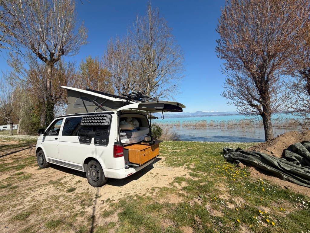 Gegen 13 Uhr erreichte ich somit den heutigen Stellplatz, noch ziemlich früh am Tag, aber dann hat man noch was vom Ort. Irgendwie war ich ziemlich geschafft und saß viel vorm Bulli und schaute aufs Wasser. Es sprangen Fische aus dem Wasser und platschten wieder rein. Auch ein Fischreier oder Haubentaucher hat frische Beute gemacht und einen ganzen Fisch einfach aufgegessen. Irgendwie Crazy. Habe ich so noch nicht gesehen.