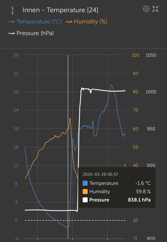 Die Temperaturen heute Nacht sanken ganz schön unter den Gefrierpunkt. Draußen waren es -5,3 Grad, gemessen unterm Auto, aber im Auto war’s nur etwas wärmer. Das Spielkind in mir findet ja Statistik-Grafiken total spannend, wahrscheinlich auch mit ein Grund, warum sämtliche Technik hier verbaut ist und ich mir hier solche Graphen anzeigen lassen kann.