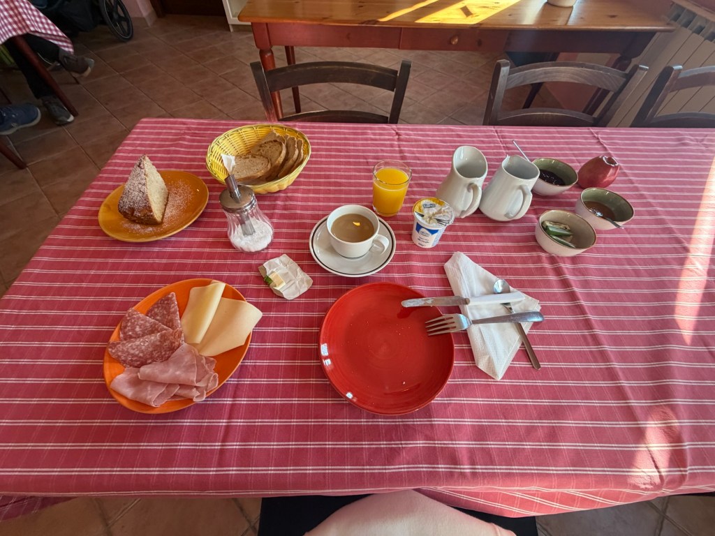 Heute Nacht stürmte es ganz schön und ich wachte auch zwischendurch mal auf. Seitdem die neuen Dämpfer im Dach verbaut sind, ist die Zeltplane viel stabiler und es flattert wenig. Heute Nacht waren es jedoch die Bäume, die ganz schön laut waren. Der Hof bietet die Möglichkeit, dort zu frühstücken. Diesen Service nutzte ich gerne. Das Pärchen aus München frühstückte auch dort und wir quatschten echt nett über Gott und die Welt.