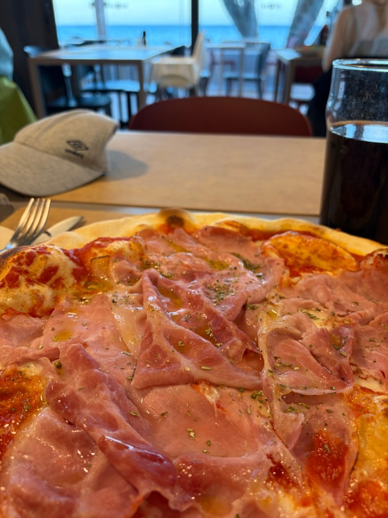 Direkt am Campingplatz ist ein kleines Restaurant mit Meerblick. Da war die Entscheidung ziemlich schnell gefallen, heute nicht zu kochen und lecker Pizza essen zu gehen. So eine italienische Pizza in Italien mit Blick aufs Mittelmeer hat einfach was. Und da es morgen wahrscheinlich weiter nach Frankreich geht, dachte ich, einmal noch italienische Pizza essen auf diesem Trip.