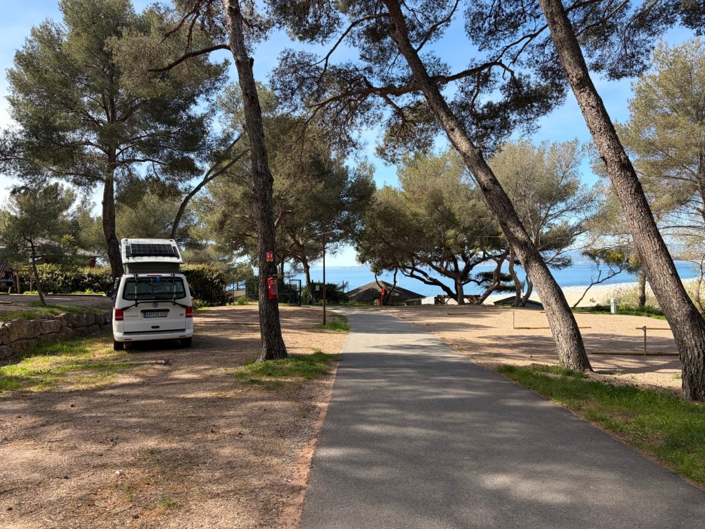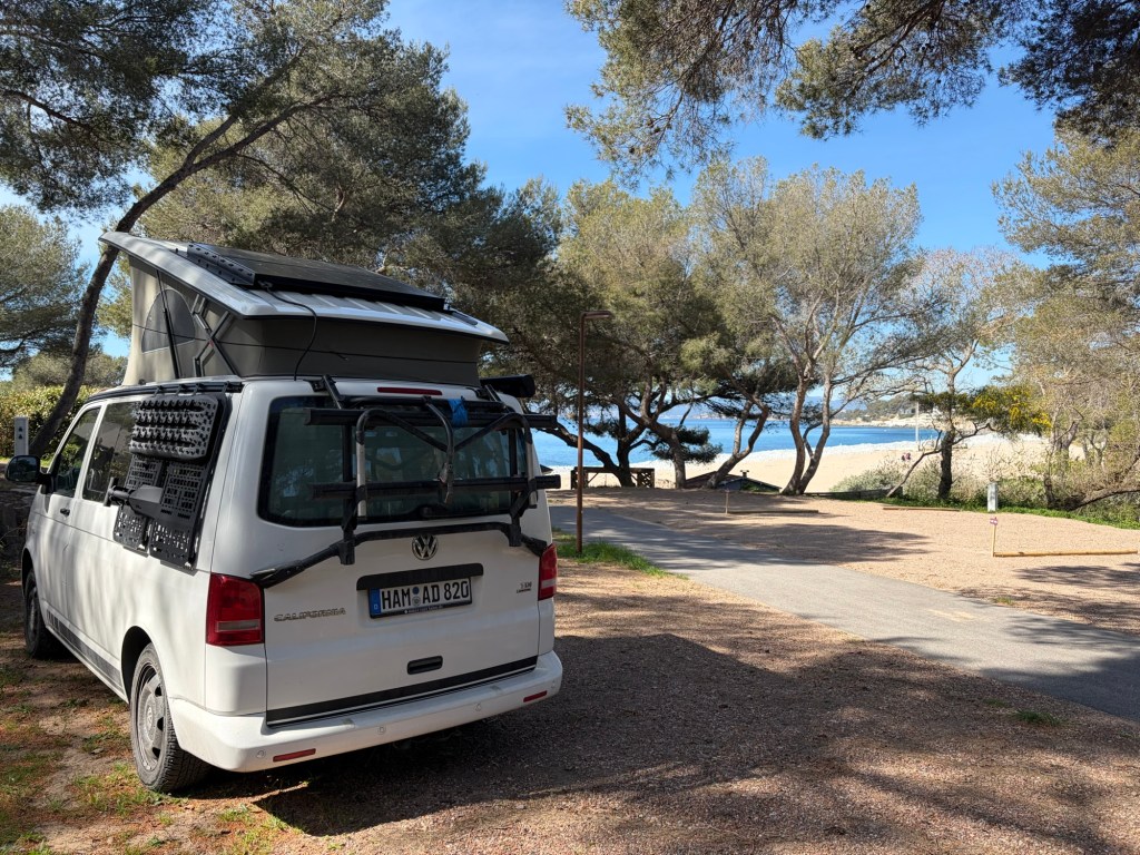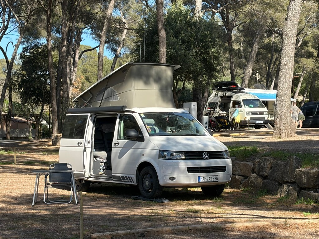 Nachdem ich heute Morgen in Ruhe gefrühstückt, mein Geschirr gespült und den Bulli wieder aufgeräumt habe, fuhr ich nur ca. 8 Minuten bis zum nächsten Campingplatz, den ich noch vor 12 Uhr erreichte. Auch mal schön nicht so lange zu fahren.