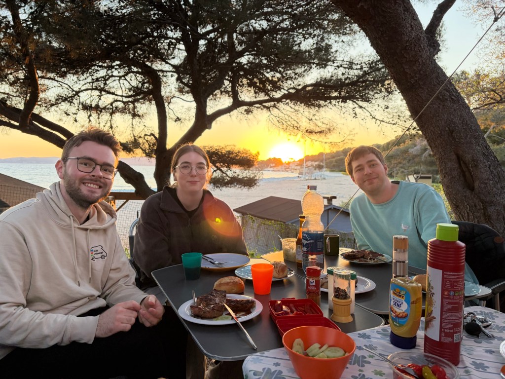 Wir quatschen viel, schauten uns den Platz an, haben abends lecker gegrillt und dann noch eine Serie geschaut. Müde geht’s jetzt in die Koje.