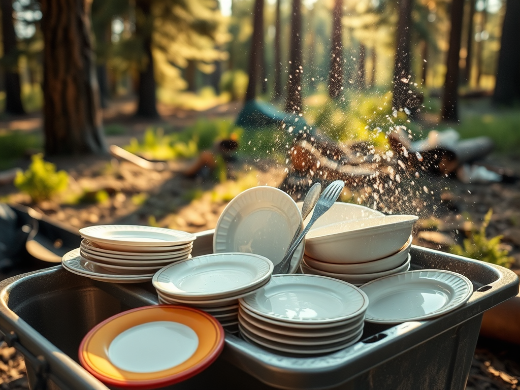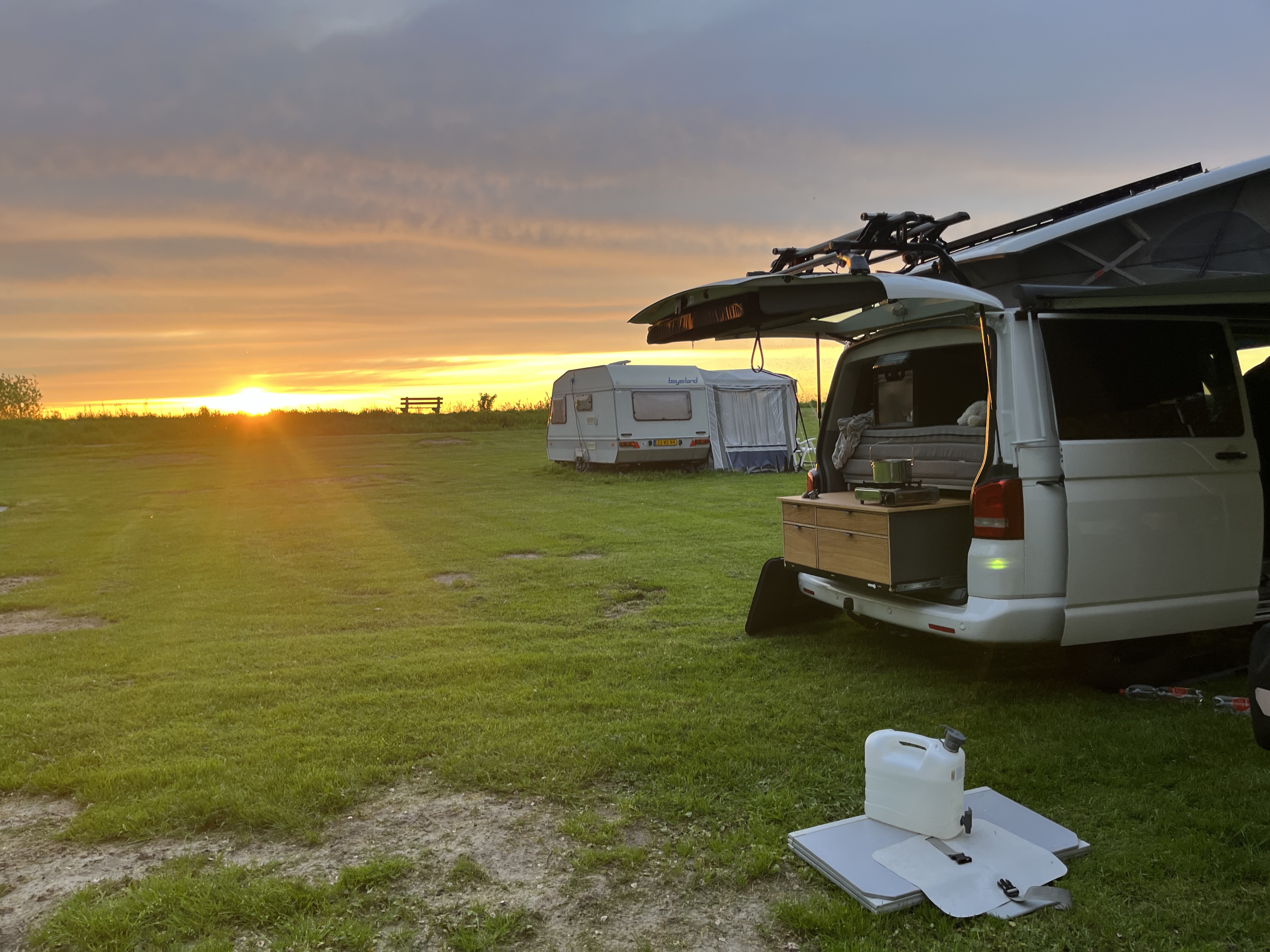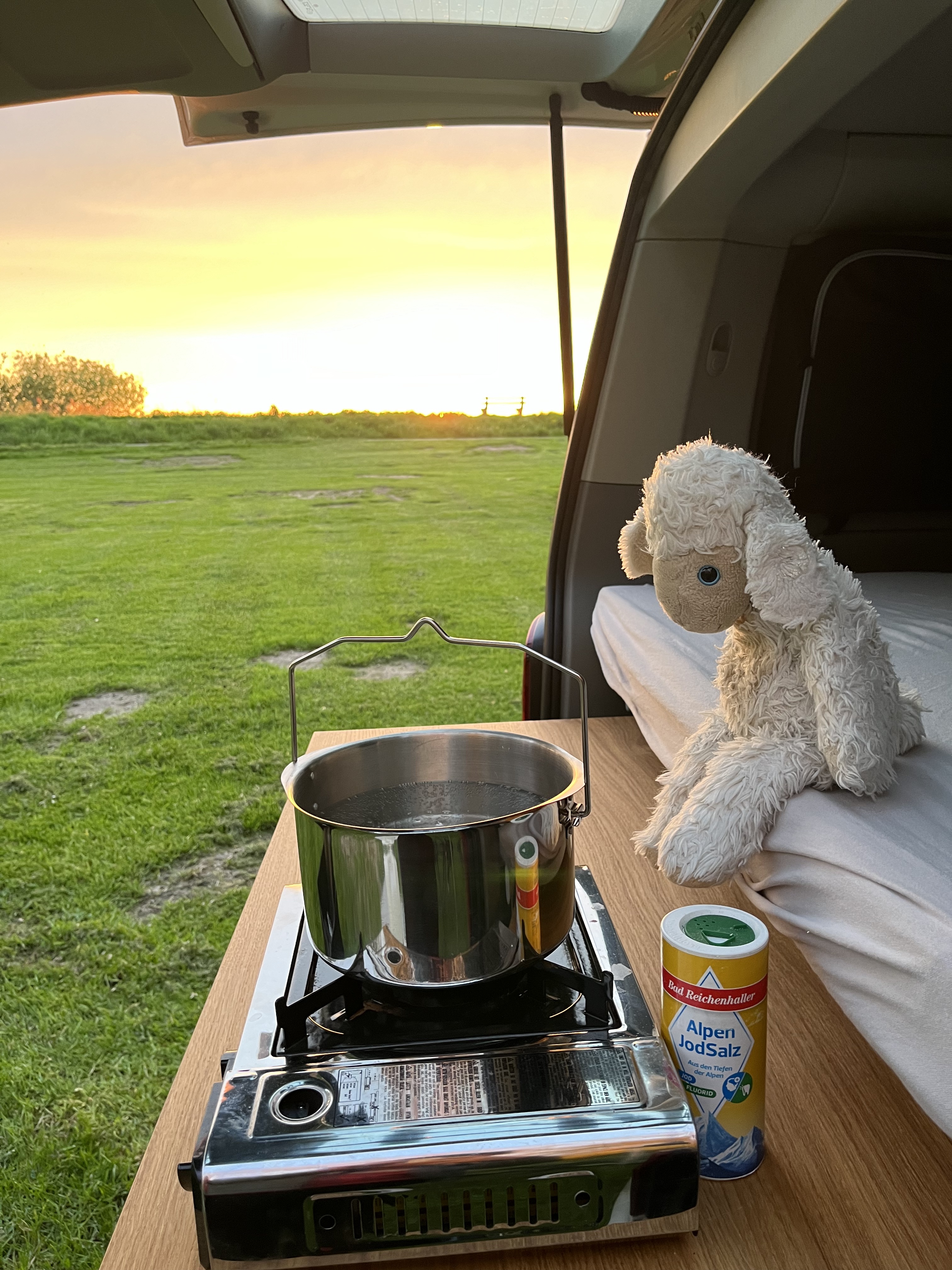 Tatsächlich gibt es Spülmaschinen für Reisemobile, die auch wirklich gut funktionieren und das Geschirr wie neu erstrahlen lassen. Doch auch hier, im VW Bus, ist dies nur eine Traumvorstellung. Gespült wird per Hand, entweder im Auto oder an den dafür vorgesehenen Spülbecken auf den Campingplätzen.