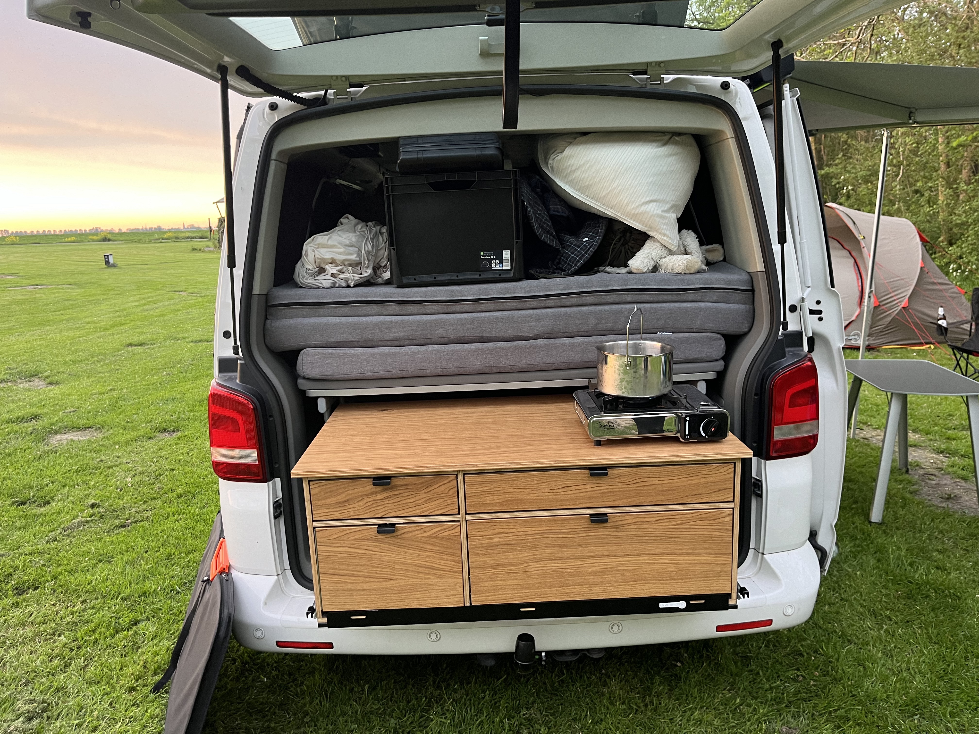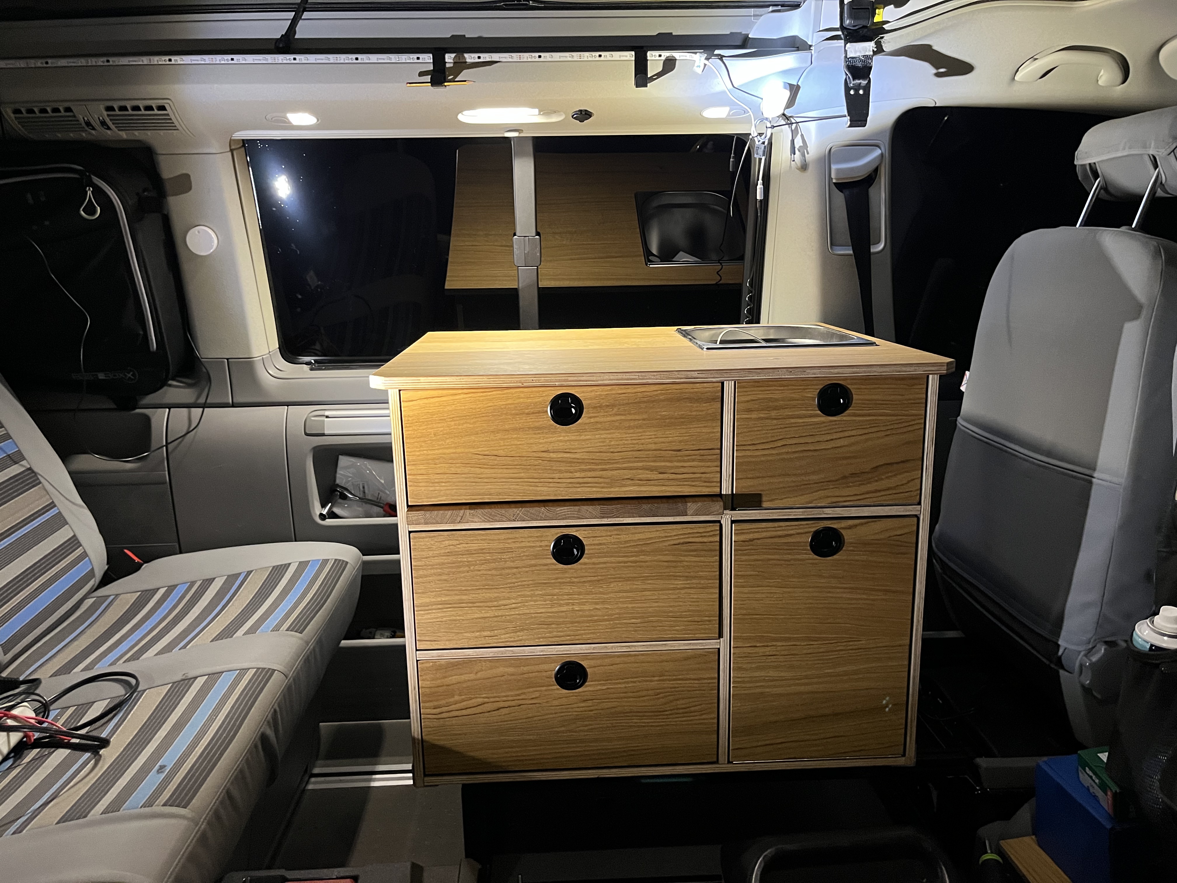 Auf den ersten Reisen hat sich dann herausgestellt, dass eine kleine Küche und vor allem etwas mehr Stauraum in Form von Schubläden hilfreich wären, um mehr Ordnung zu halten. Also wurde in liebevoller Kleinarbeit in Zusammenarbeit mit meinem Bruder eine Kiste für den Heckauszug sowie eine Küchenkiste hinter dem Fahrersitz gebaut.