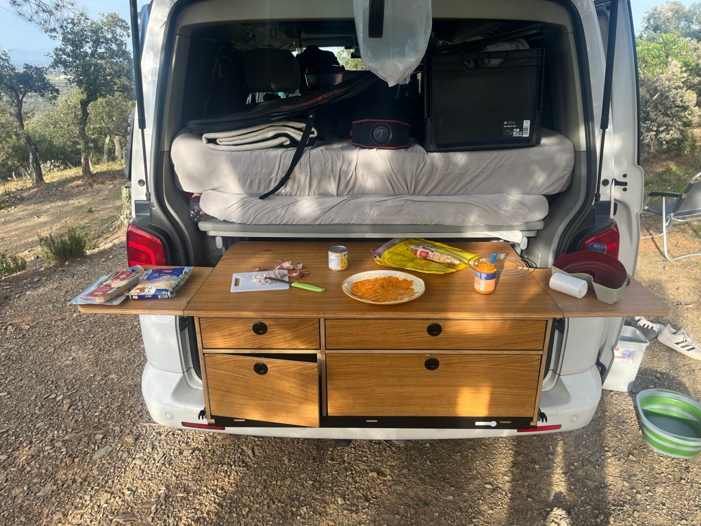 Ich wusch noch eine Maschine Wäsche, die draußen in der Sonne und dem Wind innerhalb kurzer Zeit trocken war, sehr praktisch. Ebenfalls räumte ich den Bulli ein wenig auf, fegte einmal durch und räumte die frische Wäsche wieder in die dafür vorgesehenen Taschen. Die sind echt schön platzsparend in den hinteren Seitenfenstern.